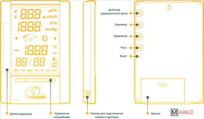 Может применяться в жилых помещениях, офисах, а также в качестве походнойметеостанции для выбора места и времени отдыха.Звуковое, световое и анимационное сопровождение момента попадания γ- илиβ-частиц в рабочую зону датчика радиации позволяет оперативно фиксироватьпоявление опасных излучений. «Сателлит-Метео» — первая метеостанция снастраиваемым под климатические особенности местности прогнозом погоды.Оригинальный корпус и индикатор с КСВ-подсветкой, плавно изменяющей вовремени свой цвет свечения, украсит интерьер жилого помещения или офиса.