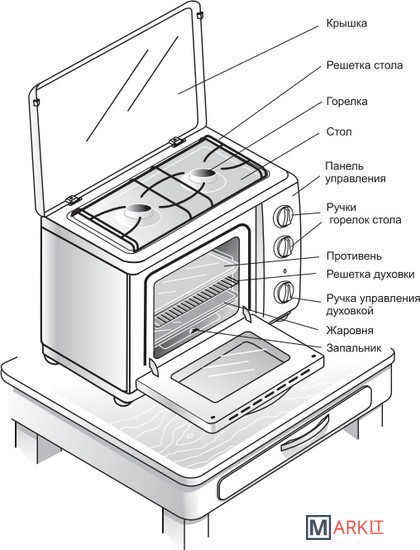 Газовая двухгорелочная мини-печь с газовым духовым шкафом.