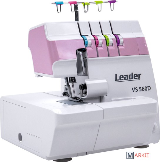 Схема заправки нитей и подсказки нанесены на панели машины. Оверлок выполняет 14 видов швов. Удобное расположение регулятора ширины обрезки ткани. Максимальная ширина шва 6,7 мм. Дифференциальная подача ткани помогут в работе со сложными эластичными и трикотажными тканями. Очень удобный механизм отключения верхнего ножа. При обработке среза шва обрезки ткани попадают в установленный мусоросборник. Для работы с узкими и мелкими изделиями удобно использовать свободный рукав, для этого снимается рукавная панель. С помощью установленного конвертера на верхний петлитель оверлок Leader VS 560D выполняет красивые ролевые швы. С левой стороны нижней панели оверлока расположен вместительный встроенный пенал, в нём удобно хранить аксессуары. Дополнительно в основную комплектацию входит нижний нож и направитель ткани. Предусмотрена система безопасности: при открытой крышке петлителей срабатывает система безопасности, и оверлок не работает.