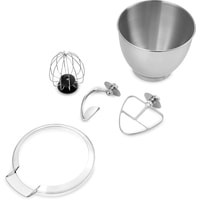 Полная комплектация - моторный блок;- чаша миксера;- крышка чаши миксера;- венчик для сбивания;- насадка для смешивания;- крюк;- руководство по эксплуатации.